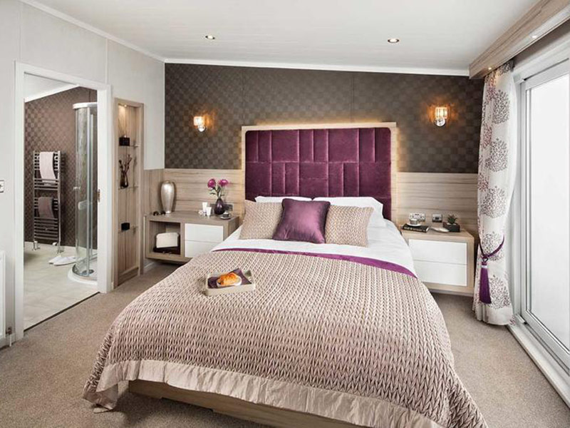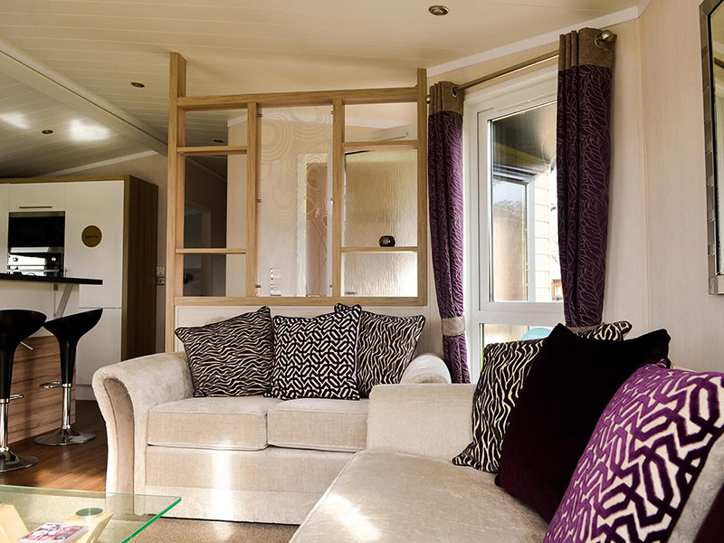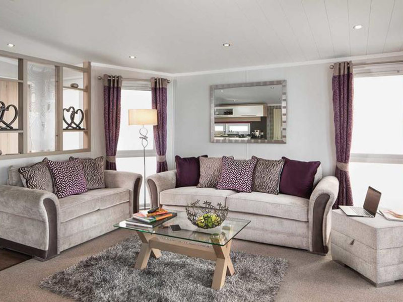Interiors feature 'Tisano Oak' woodgrain and 'Hampton' soft furnishings in shades of aubergine, stone and cream with a high specification full gloss kitchen.